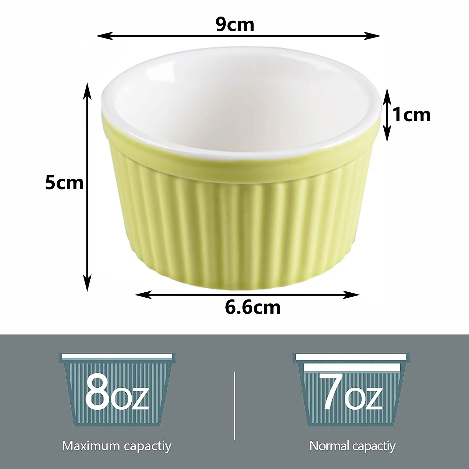 Elevate your dining experience with our exquisite set of 6 porcelain ramekins. These versatile dessert bowls are perfect for creating delectable treats and adding a touch of elegance to any table setting. Crafted from durable porcelain, these pudding cups are designed to withstand daily use and are safe for oven, microwave, freezer, and dishwasher. The vertical straight lines not only enhance the visual appeal but also provide a comfortable grip. The thickened wall panel ensures excellent heat insulation, protecting your hands from burns.