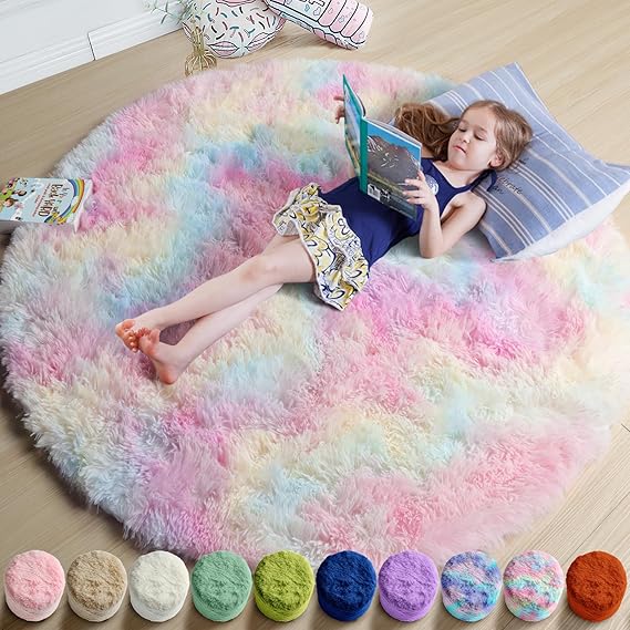 Amdrebio Rainbow Fluffy Round Kids Rug 4Ft