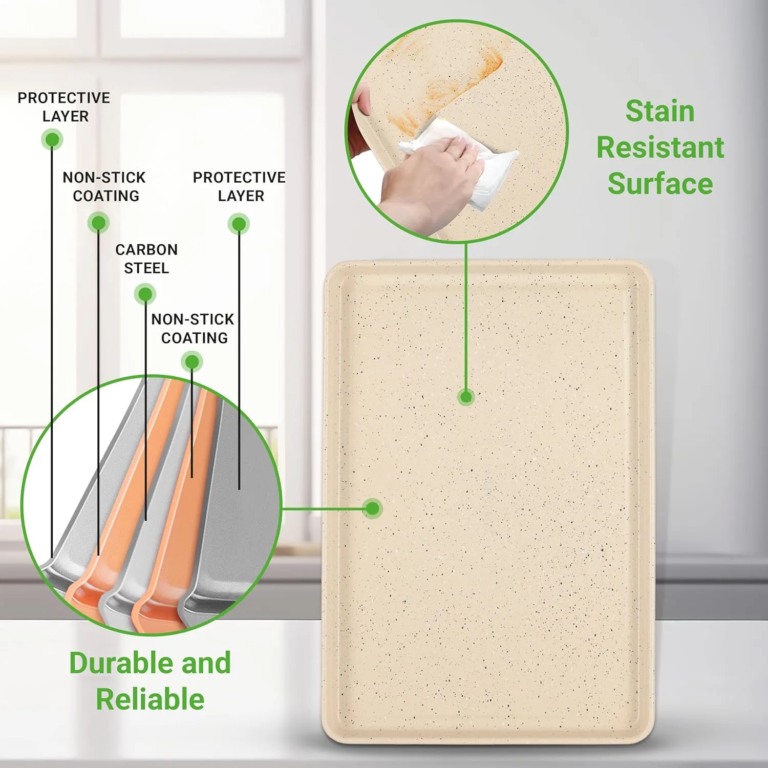 Bake up a storm with our comprehensive 8-Piece Nonstick Bakeware Set! This set equips you with everything you need for baking delicious treats and savory meals. From cookies and cakes to casseroles and lasagna, unleash your inner baker with ease. Ideal for both beginner and experienced bakers, this set takes the stress out of baking, thanks to its durable, non-stick coating that ensures effortless food release and quick cleanup. Say goodbye to stuck-on messes and hello to perfectly baked goods every time! The space-saving stackable design keeps your kitchen organized, allowing for efficient storage in any oven, countertop, or even toaster oven. The reliable non-stick surface, crafted from premium carbon steel, minimizes the need for excess oil, promoting healthier baking and making cleanup a breeze. Built to last, this sturdy and dependable set can withstand temperatures up to 450°F, guaranteeing even heat distribution for consistent and flawless results. Enjoy peace of mind knowing that our bakeware is PFOA and PFOS-free, ensuring food-grade safety for you and your loved ones. While dishwasher safe, hand washing is recommended to extend the life of your beautiful marble cream finish, which not only adds a touch of elegance to your kitchen but is also stain-resistant for a consistently sleek and clean look. This set is an essential addition to any kitchen and the perfect tool for both every-day use and special occasions. The non-stick surface helps baked goods brown evenly and prevent sticking, which means perfect pies, cookies, cakes, and other baked goods. This quality set is designed to be a staple of your kitchen, providing you with years of reliable baking. Whether you’re baking a single batch of cookies or preparing a multi-layer cake, this baking set will rise to the occasion. Get ready to create sweet and savory masterpieces.