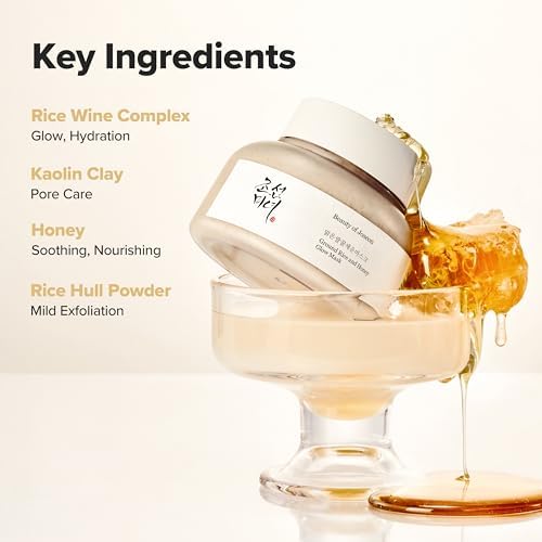 Experience the nourishing power of the Beauty of Joseon Ground Rice and Honey Glow Mask, a specially formulated Korean skin care product designed for dry and sensitive skin. This 150ml mask combines natural ingredients like honey, clay powder, and rice bran powder to provide comprehensive skin benefits including pore cleansing, sebum absorption, moisturizing, antioxidant protection, and soothing care. It helps refine your skin texture while ensuring it remains hydrated and calm without drying out.