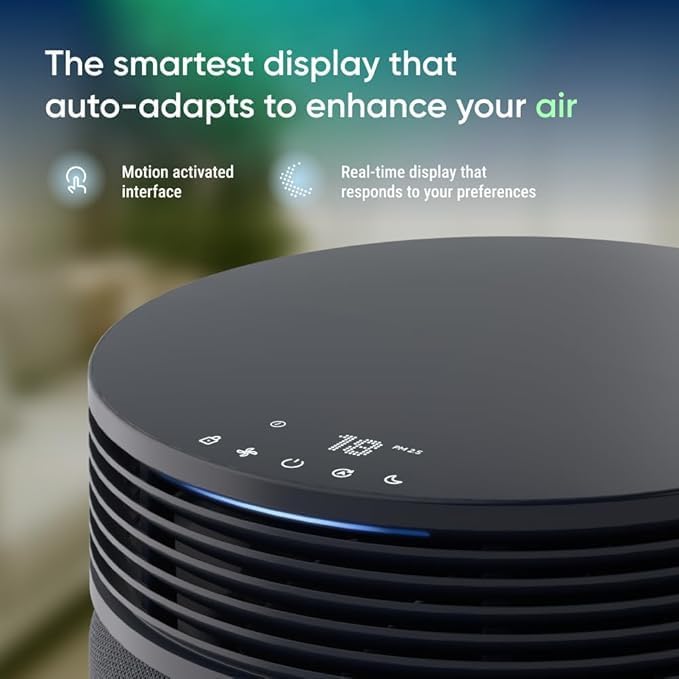 The sleek, Swedish-inspired design features a flat top surface that doubles as a side table, blending function and elegance to complement any interior. A premium dot matrix display with motion detection animates settings to make air quality monitoring engaging and intuitive. The front-facing air quality indicator shows clear, glanceable pollution levels with color-coded feedback from excellent to poor, helping you maintain the healthiest indoor environment effortlessly.