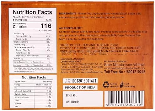 Experience the luxurious taste of Chokhi Dhani Dry Fruit Cookies, crafted using premium quality ingredients like the finest flour, rich butter, and a generous blend of almonds, cashews, and raisins. These cookies deliver a blissful balance of subtle sweetness and buttery richness, ensuring a delightful treat that is neither too sweet nor too plain.