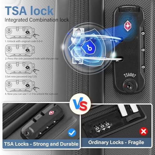 Travel confidently with the built-in TSA-approved combination lock ensuring smooth security checks worldwide without damaging your luggage. The cabin bag features smart compartments including separate dry and wet pockets, a laptop sleeve, and cable access, ideal for both short trips and long-haul journeys. Equipped with 4 smooth spinner wheels and a sturdy handle, this set guarantees effortless maneuverability and durability tested through rigorous quality assessments.