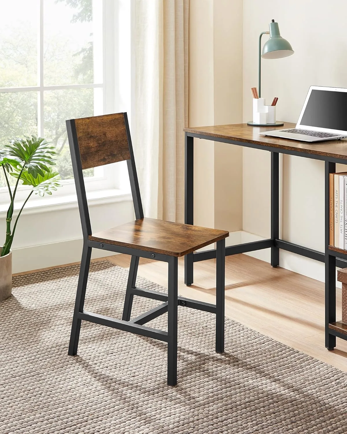 Elevate your dining experience with this industrial dining chair set. The striking combination of ink black steel frames and warm rustic brown boards creates an elegant and inviting atmosphere for your meals. Designed for comfort, these chairs feature a 102° angle between the backrest and seat, offering ergonomic support that allows you to relax and enjoy your time at the table. Stability is ensured with the steel frame, quality particleboard seat, and bottom crossbar, forming a 100° angle for maximum support and safety. Assembly is a breeze thanks to the numbered parts and clear, easy-to-follow instructions, so you can spend less time putting the chairs together and more time preparing delicious meals. This set includes two industrial dining chairs that are both inviting and comfortable. When dinner is over, simply slide them under the table for a clean, organized look. These chairs not only provide a comfortable seating option, but also add a touch of modern industrial style to your kitchen or dining room. The robust construction guarantees years of reliable use, and the attractive design complements a range of interior aesthetics, from rustic farmhouse to contemporary loft. Get ready to feast in style and comfort with these durable and stylish dining chairs.
