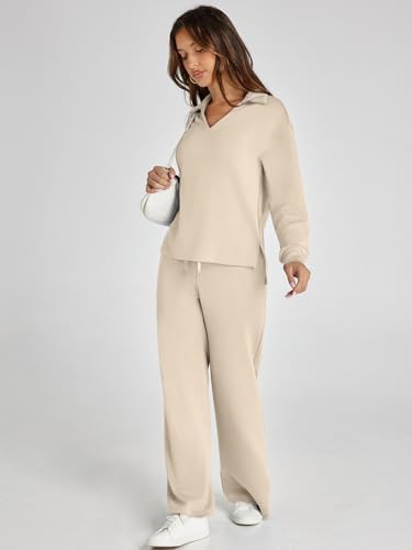 - Two-piece matching set: long-sleeved polo top and wide-leg pants