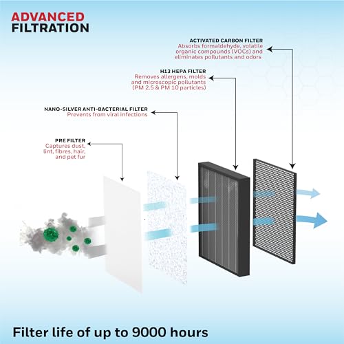 The Honeywell Air Touch V5 Air Purifier is designed to deliver clean, healthy air by combining a powerful 4-stage filtration system. With a Pre-Filter, Nano-Silver Anti-Bacterial Layer, H13 HEPA Filter, and Activated Carbon Filter, it effectively removes 99.99% of harmful particles including PM2.5, allergens, pet dander, bacteria, mold, odors, and toxic gases. This guarantees fresher and healthier indoor air quality ideal for family living spaces.