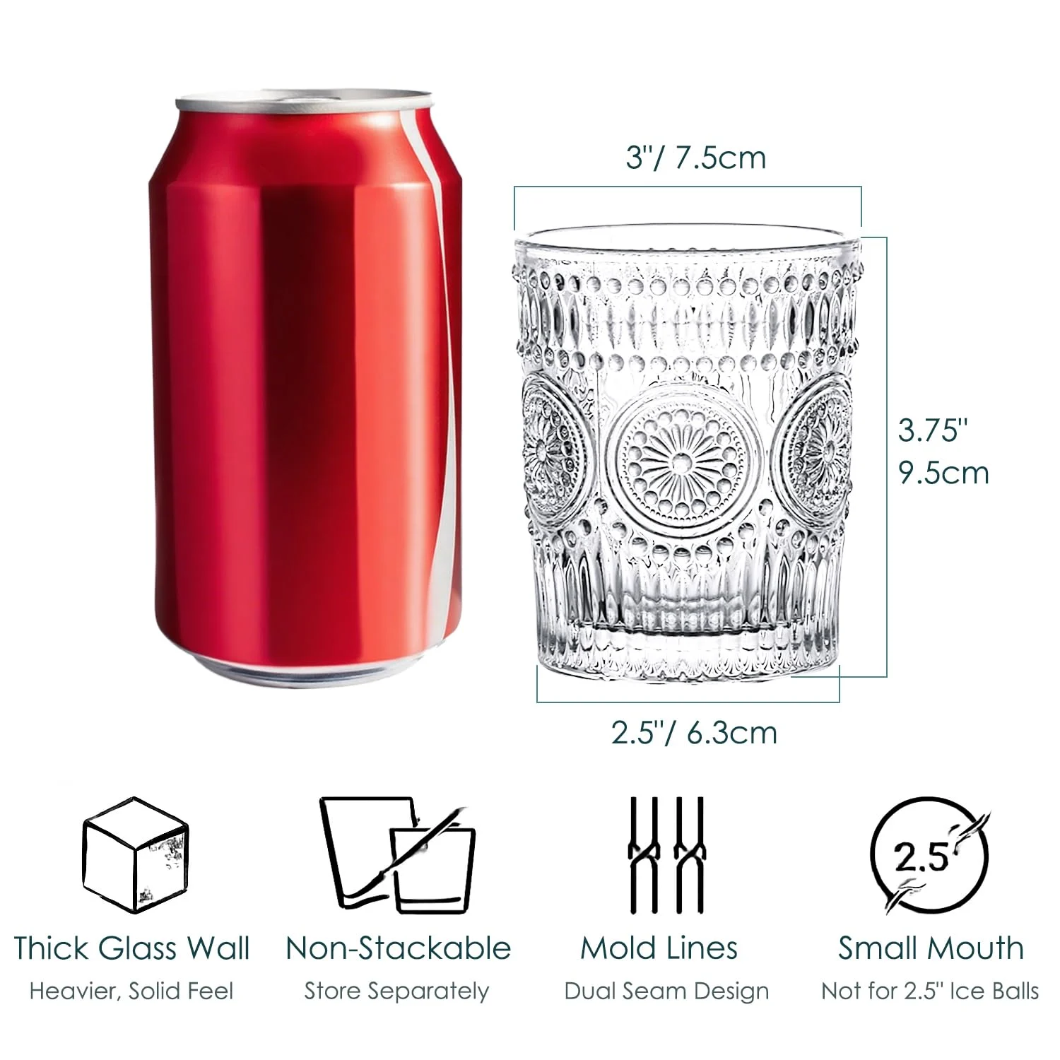 These glasses are not only functional but also make flawless decor for weddings, baby showers, parties, or any special occasion where you want to add a touch of vintage sophistication. The set of six allows you to easily accommodate guests, while the 9.5 oz capacity is ideal for a variety of drinks. Each glass measures 3-1/8″ in diameter and 4″ in height.
