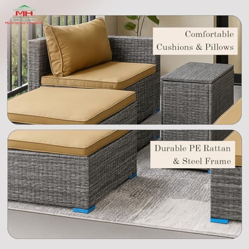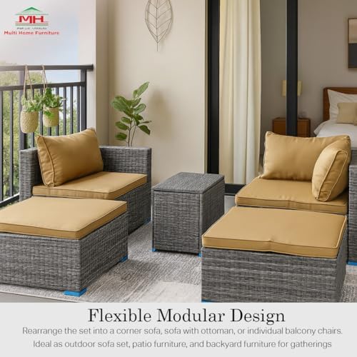 Enhance your outdoor space with the Multi Home Furniture Grey PE Rattan 5-Piece Outdoor Sofa Set, perfect for balconies, patios, and gardens. Crafted from weather-resistant grey poly rattan woven over a robust powder-coated steel frame, this set offers lasting durability and a sleek modern look. The golden cushions bring a cozy, luxurious feel, making it ideal for relaxing or entertaining guests.