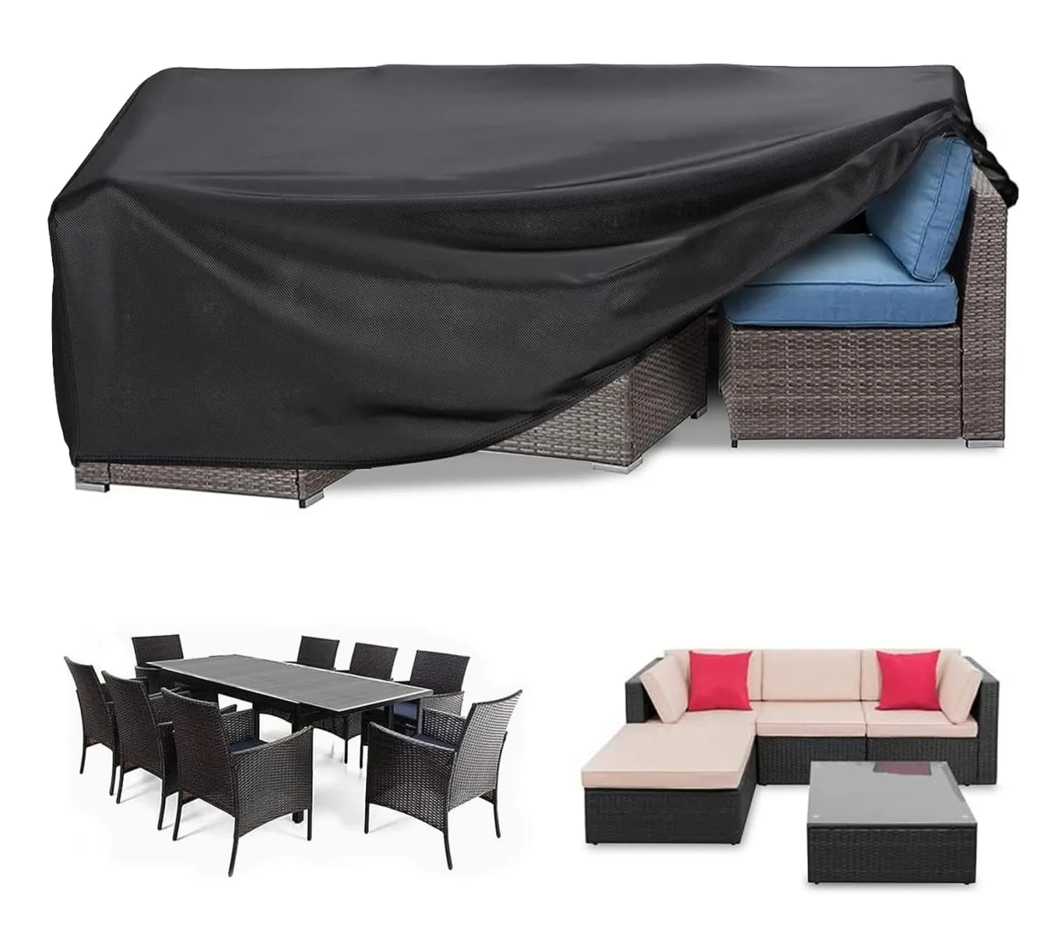 Protect your valuable outdoor furniture with our heavy-duty Patio Furniture Cover. Crafted from durable 210D PVC-lined Oxford fabric, this cover offers exceptional protection against the elements. Keep your dining sets, picnic tables, rattan furniture, and sofa sets safe from rain, dust, fading, and harmful UV rays. The waterproof material ensures your furniture stays dry, even during heavy downpours, while the UV-resistant design prevents fading under the scorching sun. Designed for longevity, this cover is tear-resistant, fire-retardant, anti-aging, and able to withstand high temperatures and even snow. Cleaning is a breeze – simply hose it down with water and let it dry in the sun. When not in use, the cover folds up neatly and can be stored in the included zippered storage bag. We’ve upgraded the design with secure windproof features, including hook & loop straps, buckles, and a drawstring, to keep your furniture protected even on the windiest days. The double-bound edges and two-thread stitching provide extra durability and prevent cracking. Whether you’re covering furniture on your balcony, in your garden, or on your patio, our Patio Table Cover is the ideal solution. Please remember to account for the distance chair backs jut out when measuring. Choose the perfect size: 180*120*74cm, 250*200*80cm, or 213*132*74cm.