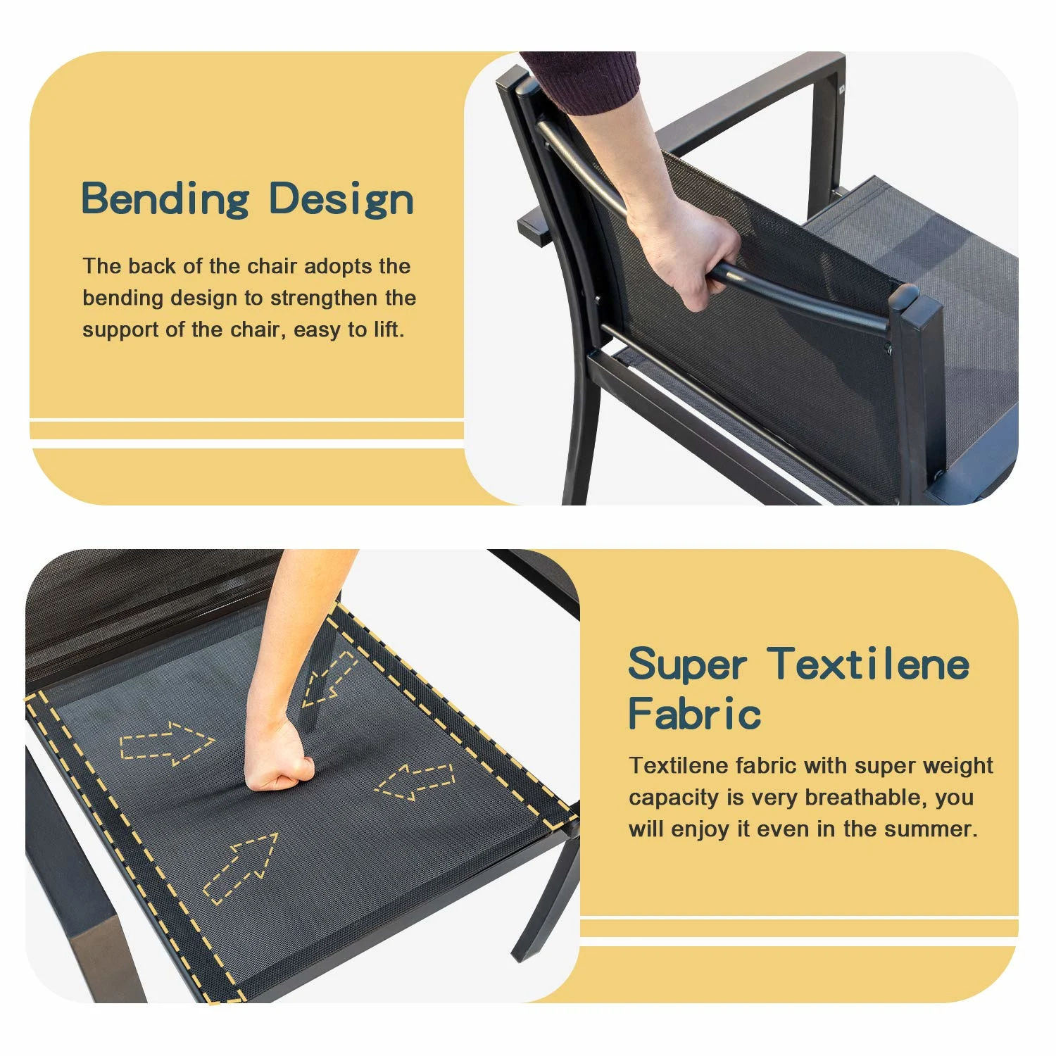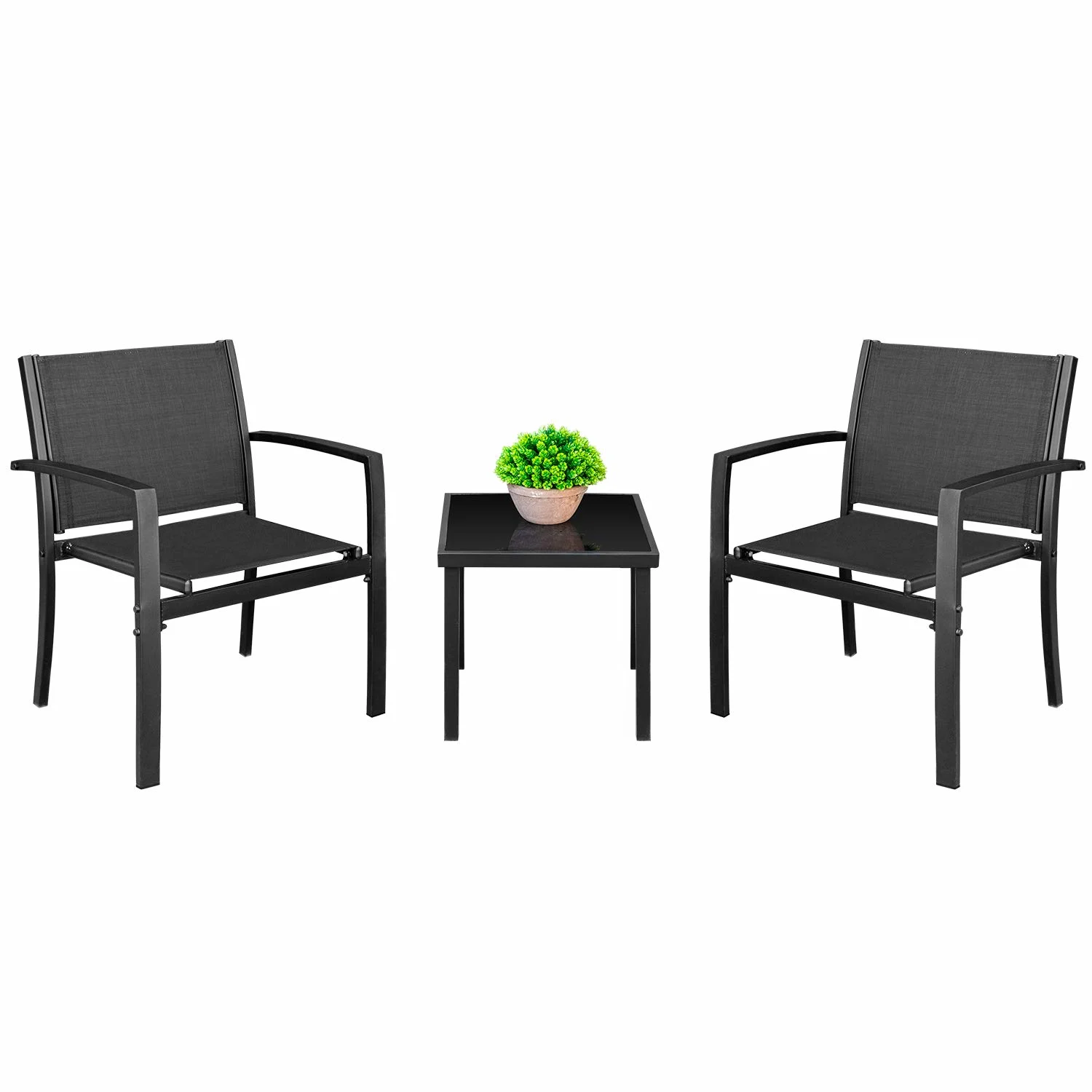 This 3-piece patio bistro set offers a perfect blend of modern style, durability, and comfort, transforming your outdoor space into an elegant leisure area. The set’s simple yet sophisticated design complements any outdoor setting, creating a welcoming atmosphere for relaxation and entertainment. Crafted with high-quality materials, this bistro set is built to withstand the elements and provide years of enjoyment. The Textilene fabric used for the chairs offers exceptional tensile strength, water resistance, and longevity, ensuring long-lasting performance. The sturdy steel tube frame, finished with a powder coating, resists rust and corrosion, making it ideal for outdoor use. With a weight capacity of up to 330 pounds, this set is designed to accommodate a wide range of users. Experience ultimate comfort with the ergonomically designed armrests that perfectly contour to your arms, providing unparalleled relaxation. The tempered glass tabletop is securely embedded in the frame, preventing sliding and damage, while screw protection covers prevent rusting, further enhancing the set’s durability and aesthetic appeal. This bistro set is not only stylish and comfortable but also practical and easy to maintain, making it the perfect addition to your patio, garden, or balcony. Enjoy countless hours of relaxation and conversation with friends and family in this elegant and durable outdoor bistro set. This set creates an elegant atmosphere to any outdoor space. The combination of metal and fabric can perfectly blend into different environments, providing you with a leisure space. Enjoy peace of mind knowing that you’re investing in a high-quality product that will enhance your outdoor living experience for years to come. Upgrade your outdoor space today and create your space to your own outdoor paradise.