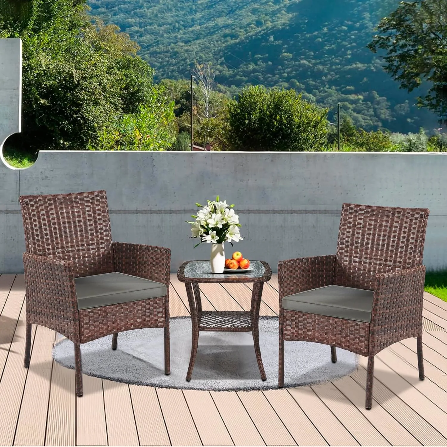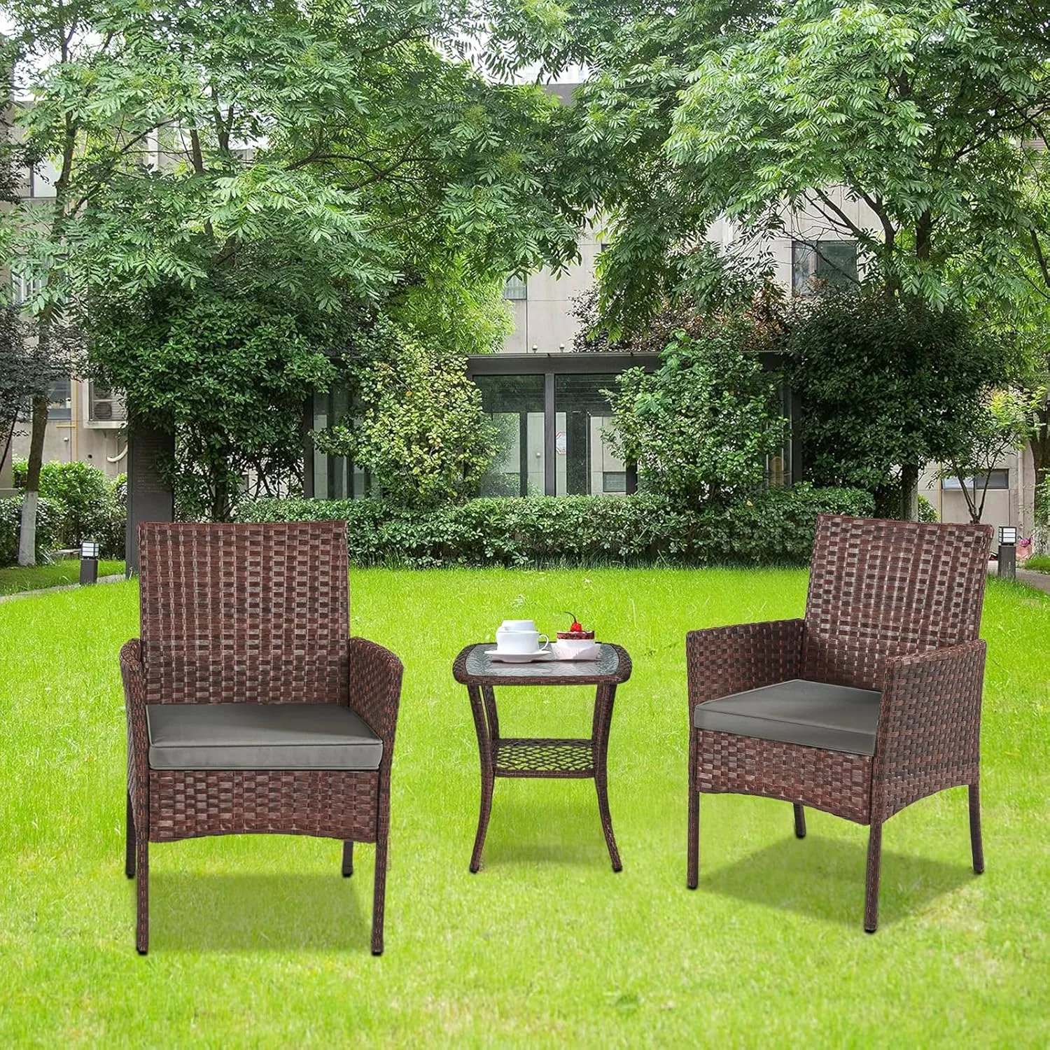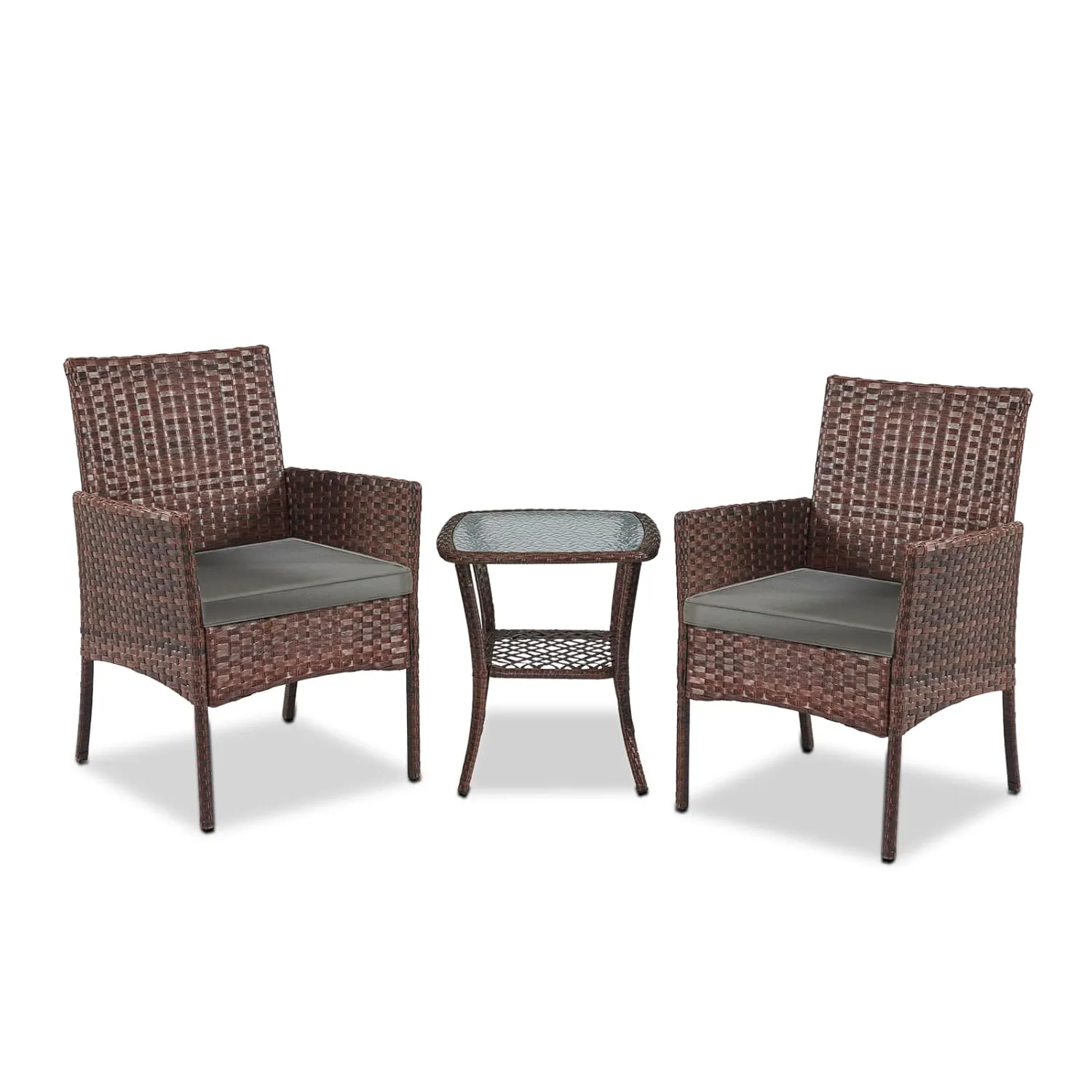 Enhance your outdoor living space with this stylish and comfortable 3-piece patio furniture set. Perfect for courtyards, balconies, backyards, porches, gardens, and poolside areas, this set provides a cozy and inviting spot to relax and enjoy the outdoors. The set includes two single chairs and a sleek glass-topped table, offering a versatile arrangement that can be customized to fit your specific space and preferences. Crafted with durable PE rattan, this set is designed to withstand the elements. The rattan is not only high-strength but also anti-ultraviolet, non-fading, and waterproof, ensuring long-lasting beauty and easy maintenance. Simply wipe it clean with water to keep it looking its best. The chairs feature comfortable cushions made of 180g polyester cloth and filled with 18-20D6cm sponge. These cushions provide excellent support and comfort for extended periods of lounging. The zippered covers are removable and washable, making it easy to keep them clean and fresh. The table features a transparent glass top with black screen printing, combining style and functionality. The glass is high-strength and lightweight, making it easy to clean with a simple wipe or water. The frame of the set is constructed from galvanized iron pipe, which offers exceptional anticorrosion resistance, ensuring the furniture remains sturdy and stable for years to come. Each chair has a static pressure capacity of 150KG, providing reliable support. The four-foot plastic design not only prevents skidding but also protects your floor from scratches. Assembly is a breeze with our KD style packaging and step-by-step installation instructions. If you encounter any questions during the assembly process, our customer service team is readily available to assist you. Create a relaxing and inviting outdoor oasis with this durable, stylish, and easy-to-assemble patio furniture set.
