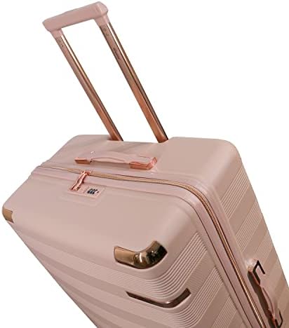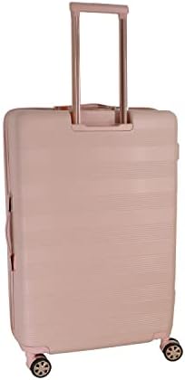 Equipped with four quiet double spinner wheels and a telescopic multistage aluminum handle with shock absorption capabilities, this suitcase glides effortlessly in all directions, reducing strain on your arms and shoulders. Its elegant milk pink finish with reinforced corners ensures you travel in style while protecting your luggage from impacts.