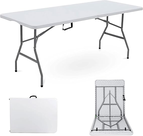 Measuring 183 cm in length, 76 cm in width, and 74 cm in height when open, this table provides ample space for serving meals, displaying products, or hosting party essentials. The compact folded size of 91.5 x 76 x 8.6 cm ensures easy storage and transport, with a built-in carry handle enhancing portability.