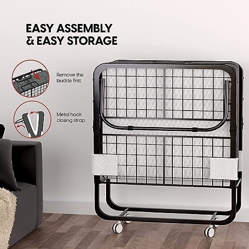 Unlike traditional rollaway beds, this model includes two velcro straps that secure the mattress firmly to the sturdy steel frame, eliminating mattress movement and increasing stability. The reinforced full-steel wire lattice frame boasts a weight capacity up to 300 lbs and operates silently without creaking. Equipped with smooth, flexible wheels, it can be effortlessly rolled to any room, making transitions seamless.