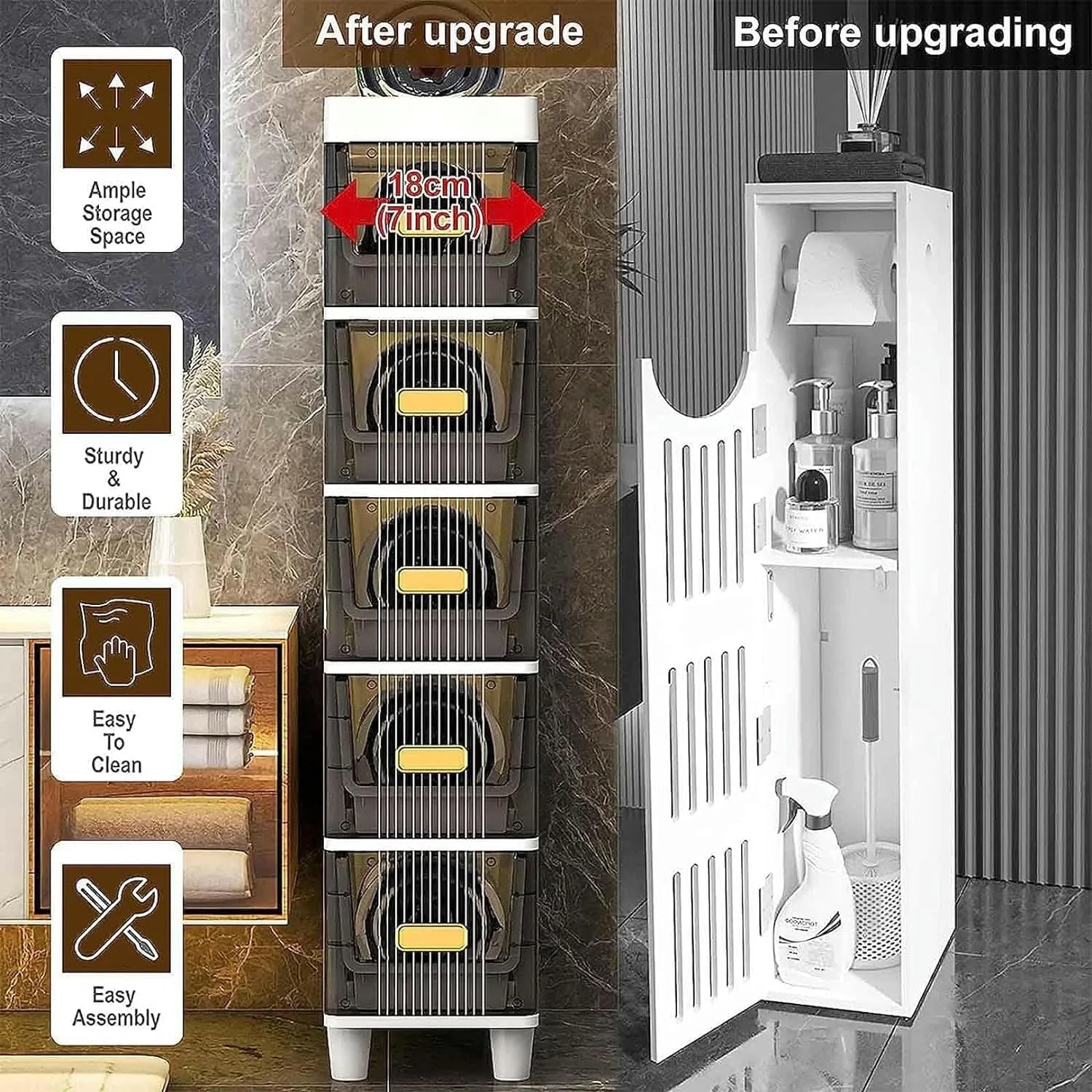 Optimize your space with this Slim Bathroom Storage Cabinet. Perfect for tight corners, it offers ample storage with durable PP construction and easy assembly. A great organizer!