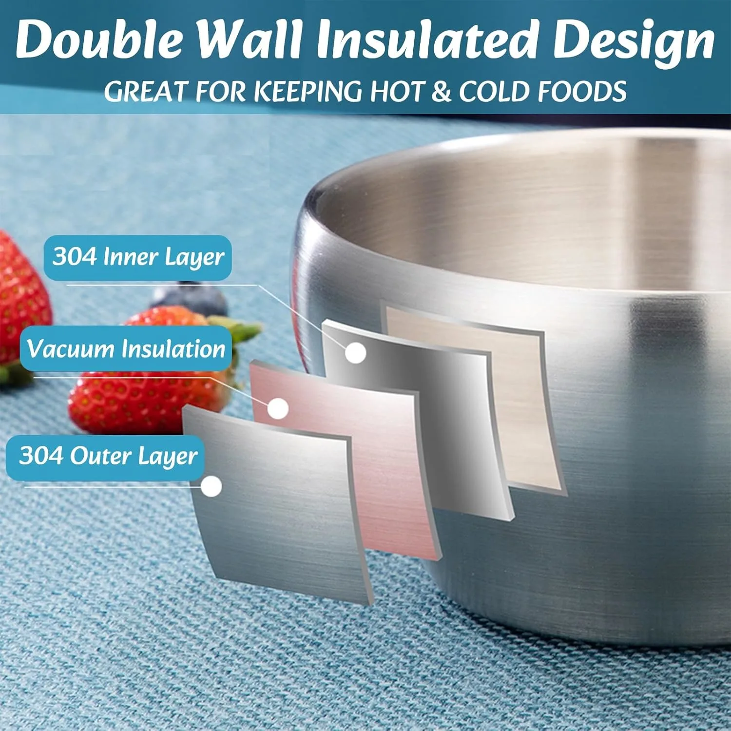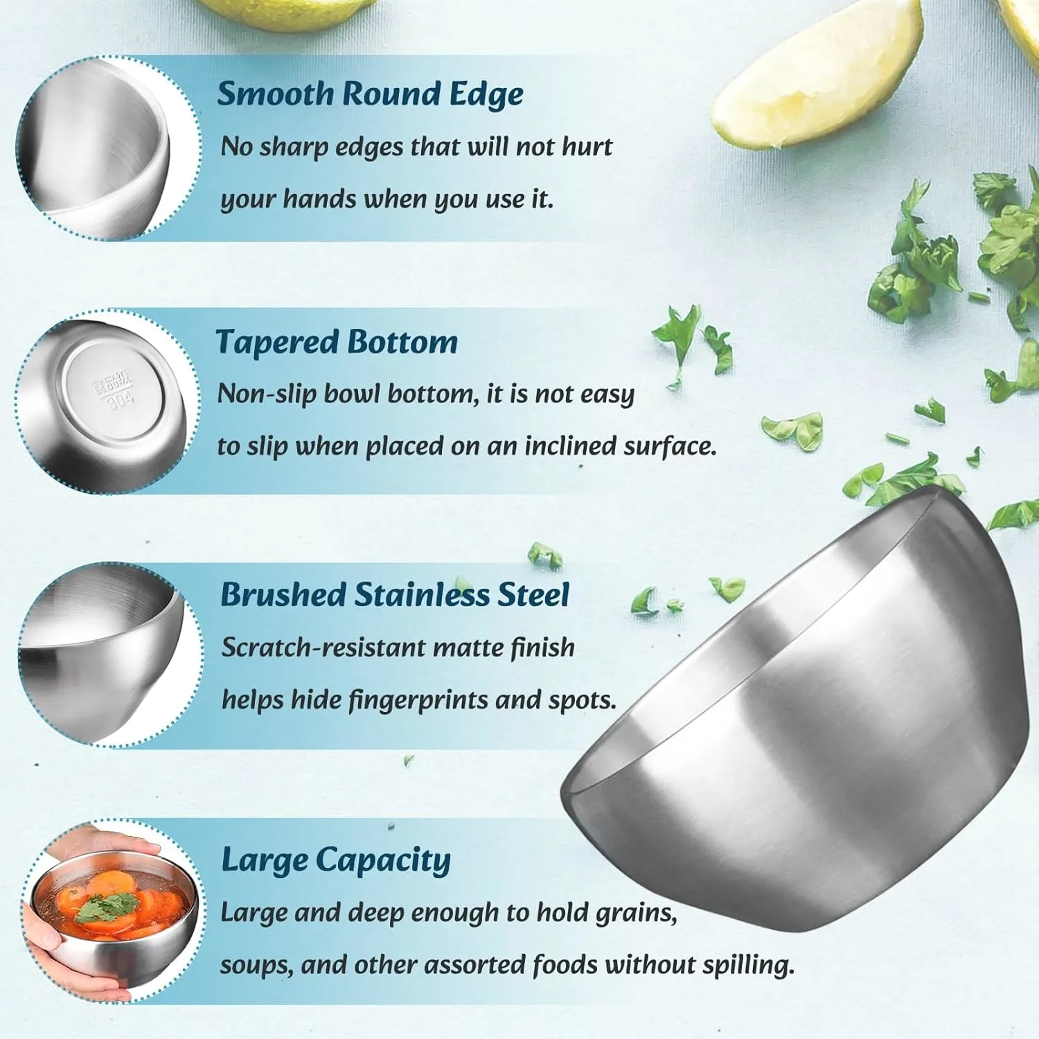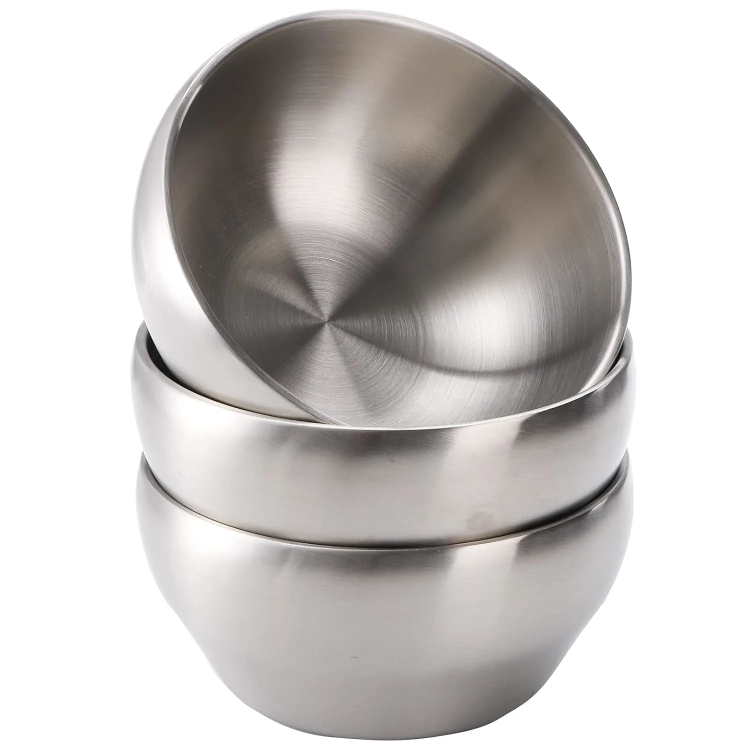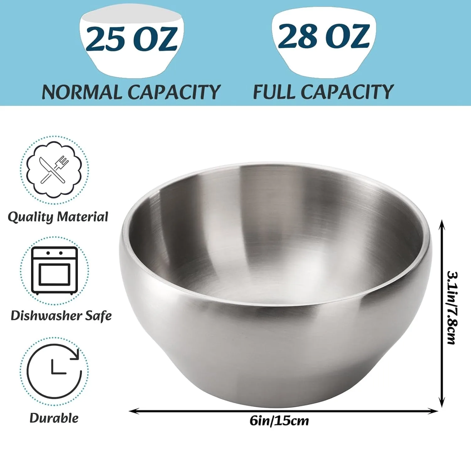 Enjoy your favorite meals with the YOUEON set of 3 double-walled stainless steel bowls! These versatile bowls are perfect for everything from hot soups to cold ice cream, offering a comfortable and durable dining experience. Each bowl measures 6 inches in diameter and 3.1 inches in height, with a generous 28oz capacity. The double-wall insulated design keeps hot foods hot and cold foods cold, without transferring the temperature to your hands. Say goodbye to burnt fingers and uncomfortable chills! Crafted from food-grade brushed SUS304 stainless steel, these metal bowls are built to last. They’re unbreakable, resistant to rust and corrosion, and free from harmful chemicals, ensuring the safety of your food. The brushed finish not only adds a touch of elegance but also helps conceal fingerprints and spotting, keeping your bowls looking their best. Cleaning is a breeze, whether you choose to wash them by hand or in the dishwasher. The scratch-resistant matte finish on both the interior and exterior hides wear and tear, maintaining the bowls’ pristine appearance even with daily use. The tapered bottom design makes these bowls easy to hold, even when sitting on the couch. They’re also stackable for convenient storage, saving valuable space in your kitchen cabinets. These bowls are incredibly versatile, perfect for rice, soup, ice cream, cereal, snacks, noodles, and more. Use them at home, in restaurants, or even for outdoor gatherings. Please note that due to the manufacturing process, the bowls may exhibit weak magnetism, but rest assured, they are made from food-grade stainless steel and are safe for food contact. Elevate your dining experience with these stylish and functional stainless steel bowls!