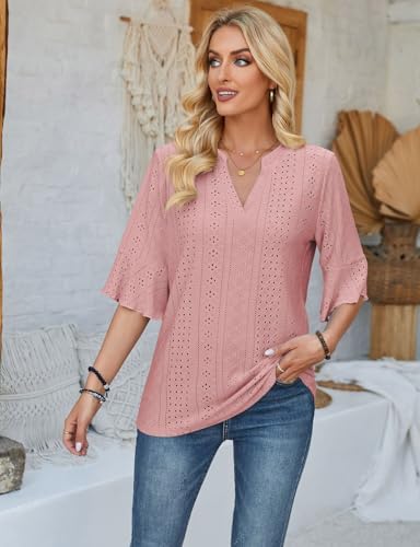 The Sthxyfaith Women 3/4 Sleeve Eyelet V-Neck Tops combine casual comfort with a touch of dressy elegance. Crafted for women who appreciate both style and ease, these loose-fitting tops feature delicate eyelet detailing that adds a subtle feminine flair. The 3/4 length sleeves with charming ruffle accents provide a flattering silhouette while keeping you cool and comfortable throughout the day.