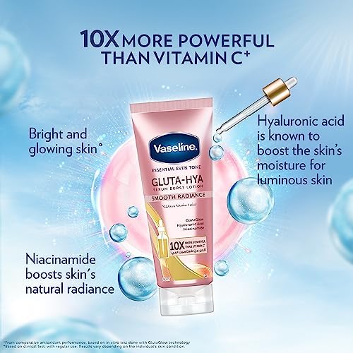 Experience deeply moisturised, smooth, and even-toned skin with Vaseline Even Tone Body Lotion. Powered by GlutaGlow technology, this lotion delivers antioxidant benefits that are 10 times more potent than traditional Vitamin C, helping to boost your skin’s natural radiance. The unique blend of hyaluronic acid deeply hydrates while restoring a luminous glow, making dull and dry skin visibly healthier.