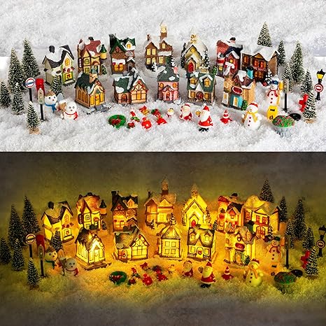 - Complete 48-piece set with houses, trees, snowmen, and festive accessories