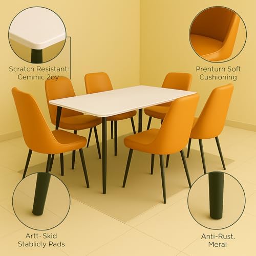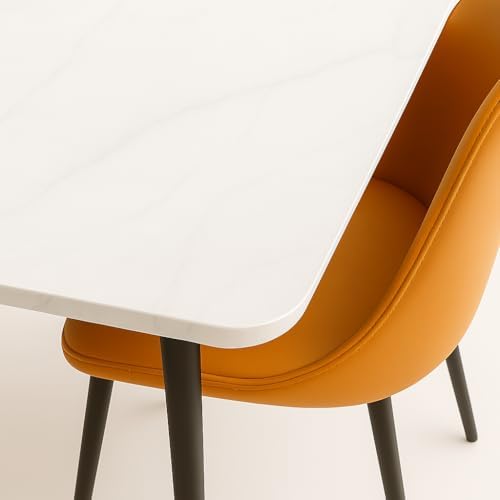 The set includes six soft orange padded chairs that add a warm and inviting touch to any room. These chairs are ergonomically designed for comfort, making every meal a relaxing occasion. The easy-clean, scratch-resistant tabletop ensures maintenance is hassle-free, perfect for busy households or entertaining guests. Whether hosting dinner parties or enjoying casual meals, this dining set blends contemporary design with lasting functionality.