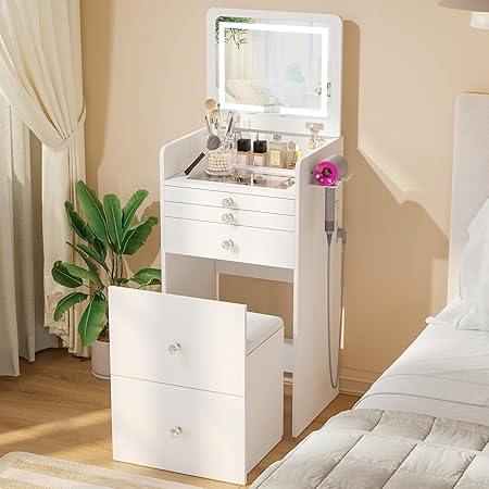 - Flip-up mirror and stowable stool maximize space efficiency